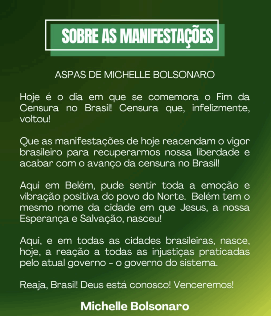 No domingo (3), durante um ato no centro de Belém (PA), Michelle afirmou que Bolsonaro é vítima de perseguição política e que os direitos do casal e de seus aliados estão sendo sistematicamente cerceados. “O meu marido está sofrendo censura prévia. Ele foi silenciado, e muitos foram silenciados antes”, declarou a ex-primeira-dama, também defendendo a anistia de presos pelos atos antidemocráticos de 8 de janeiro.