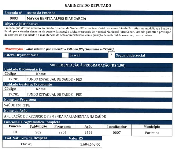 Adicionalmente, outra emenda de R$ 5.604.643,00 foi destinada ao mesmo fundo, com o propósito de custear a atenção básica e especial do Hospital Municipal Jofre Cohen, visando garantir a prestação de serviços de qualidade e a manutenção administrativa.