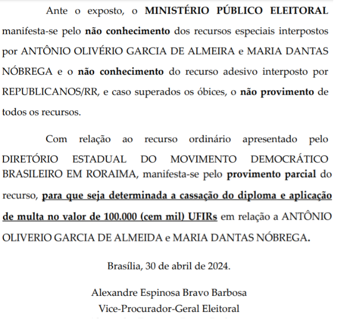 O documento, elaborado pelo Vice-Procurador-Geral Eleitoral, ministro Alexandre Espinosa Bravo Barbosa, refuta os recursos apresentados pela defesa de Denarium, reiterando a necessidade de cassação do seu diploma. Além disso, o parecer defende a aplicação de uma multa de 100.000 UFIRs, valor que ultrapassa R$ 100 mil.