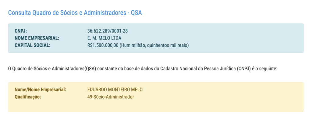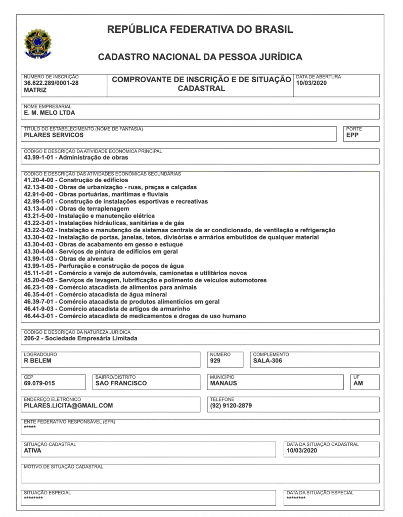 A E.M. Melo LTDA, com sede em Manaus, tem como atividade principal a administração de obras e possui capital social de R$ 1,5 milhão.