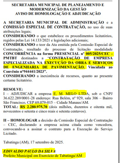 De acordo com os registros oficiais, o Contrato nº 005/2025 foi firmado com a empresa E.M. Melo LTDA, no valor de R$ 2.280.975,70.