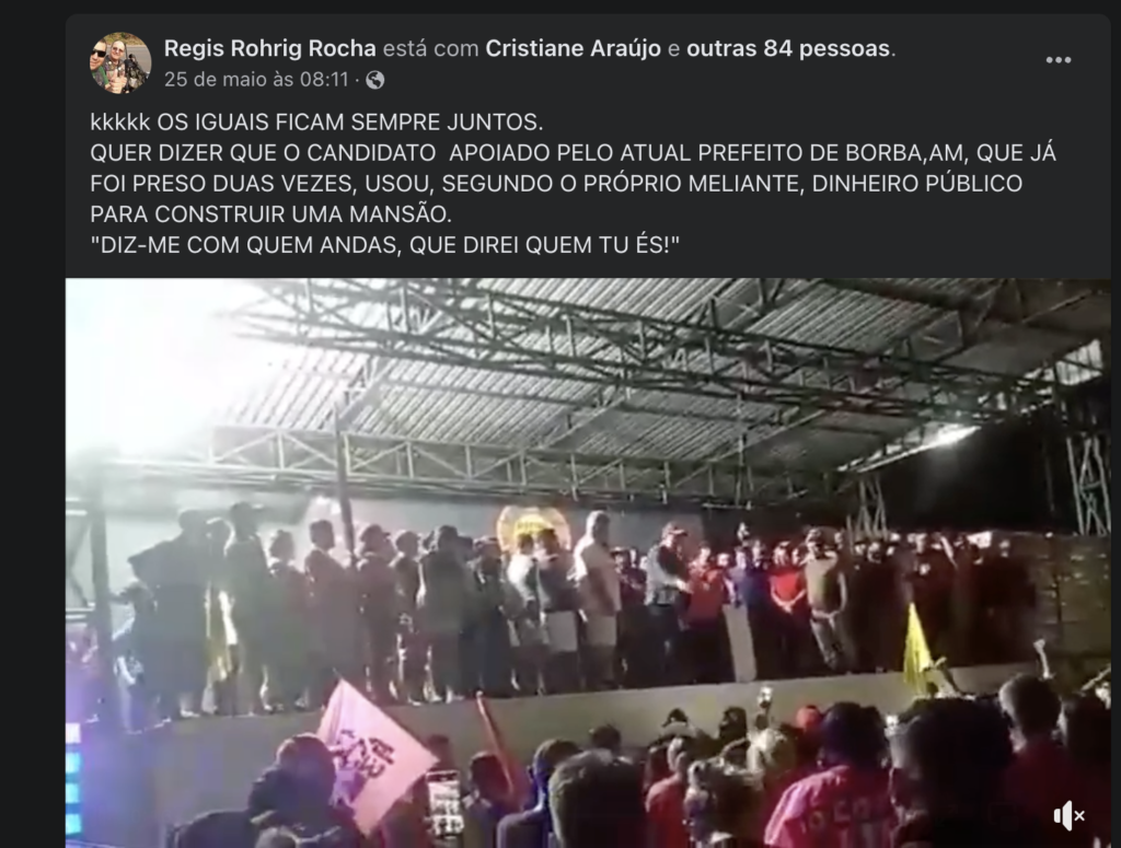 Outro morador, Regis Rohrig Rocha, também criticou o incidente. “Os iguais ficam sempre juntos. Quer dizer que o candidato apoiado pelo atual prefeito de Borba, que já foi preso duas vezes e usou, segundo o próprio meliante, dinheiro público para construir uma mansão, agora distribui dinheiro em eventos? ‘Diz-me com quem andas, que direi quem tu és!’,” escreveu Regis, lembrando episódios anteriores envolvendo Simão Peixoto, alvo da “Operação Garrote”.
