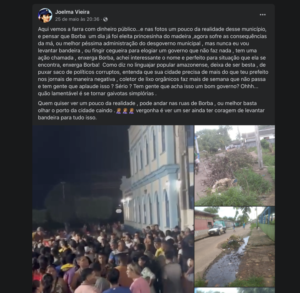 Joelma Vieira, uma cidadã de Borba, expressou sua indignação nas redes sociais. “Aqui vemos a farra com dinheiro público… e nas fotos, um pouco da realidade desse município. Borba, que um dia já foi eleita princesinha do Madeira, agora sofre as consequências da má, ou melhor, péssima administração do desgoverno municipal. É vergonhoso ver a cidade nesse estado, com lixo acumulado e o porto em ruínas, enquanto o prefeito e seus aliados se envolvem em escândalos,” desabafou Joelma.