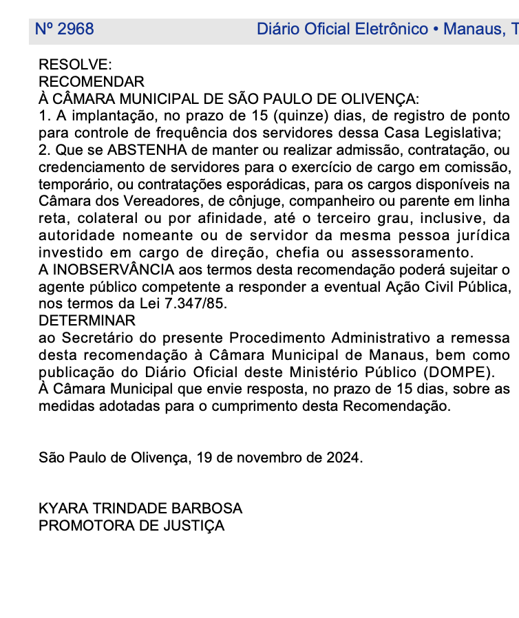 Amazonas – O Ministério Público do Amazonas (MP-AM) emitiu uma recomendação à Câmara Municipal de São Paulo de Olivença para implantar, em até 15 dias, um sistema de registro de ponto eletrônico. A medida é uma resposta a denúncias de nepotismo e irregularidades administrativas, incluindo a ausência de controle de frequência de servidores e episódios de condutas inadequadas no parlamento. A recomendação foi publicada no Diário Oficial do MP-AM em 19 de novembro de 2024.