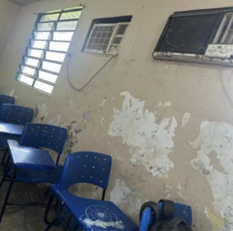 A unidade de ensino apresenta diversas irregularidades que comprometem a segurança da comunidade escolar e resultaram na suspensão das aulas, como rede elétrica em situação crítica, banheiros insalubres, salas sem iluminação e climatização adequadas, além da falta de profissionais de apoio.
