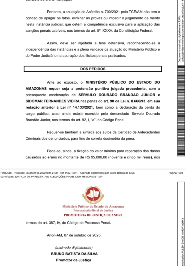 O processo segue em andamento e os réus, incluindo Sidomar Vieira e Servulo Brandão, respondem às acusações em liberdade, amparados pelos princípios do contraditório e da ampla defesa. O MP reforça que a condenação definitiva depende do julgamento final, mas sustenta que as provas — incluindo a impossibilidade física da realização da licitação no feriado — são contundentes para justificar as sanções penais e a multa requerida.