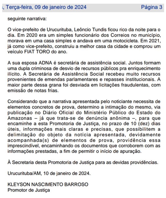 O despacho do promotor de Justiça, Kleyson Nascimento Barroso, ressalta a necessidade de elementos concretos de prova para embasar a investigação. O noticiante, que optou por manter sua identidade anônima, foi intimado a fornecer informações mais detalhadas no prazo de 10 dias úteis. Essas informações devem delimitar o objeto da denúncia e ser acompanhadas de elementos de prova que sustentem as alegações apresentadas.