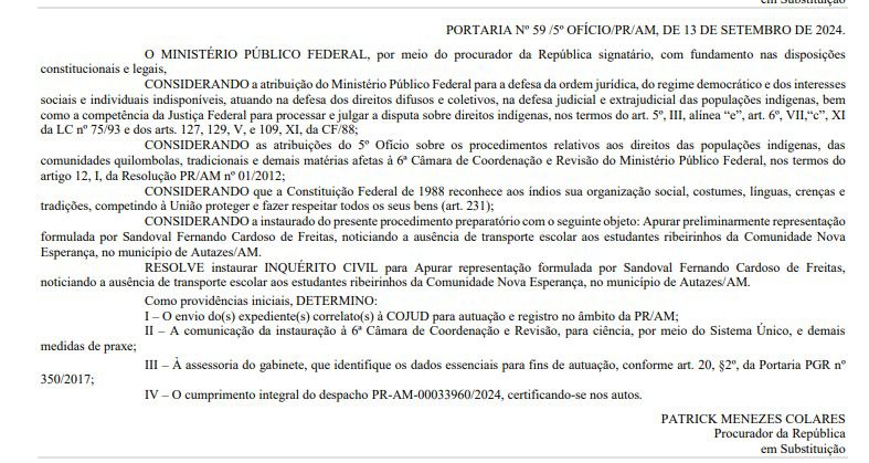 Amazonas – O Ministério Público Federal (MPF) instaurou um Inquérito Civil para investigar a ausência de transporte escolar aos ribeirinhos da comunidade Nova Esperança, localizada no município de Autazes (AM). A ação foi motivada por uma representação apresentada por Sandoval Fernando Cardoso de Freitas, que alegou a falta desse serviço essencial.