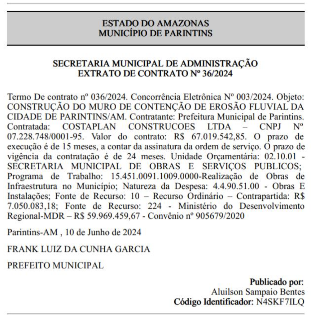 Amazonas – A construção de um muro de contenção de erosão fluvial na orla de Parintins, cidade localizada a 369 quilômetros de Manaus, está prevista para custar R$ 67.019.542,85 aos cofres públicos. Esses recursos são provenientes do governo federal, especificamente do Ministério do Desenvolvimento Regional (MDR). A informação foi confirmada pelo prefeito Bi Garcia (PSD), que anunciou a Constaplan Construções Ltda como a vencedora do processo licitatório.