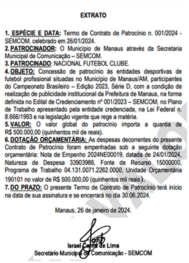 O Nacional Futebol Clube, cuja presidência é exercida por Augusto Ferraz (UB), prefeito de Iranduba, foi contemplado com o contrato assinado por Israel Conte de Lima, secretário de comunicação da Prefeitura de Manaus. O patrocínio está destinado a “entidades desportivas de futebol situadas no município de Manaus/AM participantes da série ‘D’ do Campeonato Brasileiro”.