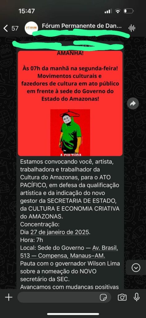 Diante do cenário, um ato pacífico está sendo organizado para o dia 27 de janeiro, em frente à sede do Governo do Amazonas. A convocação pede a participação de artistas, trabalhadores e amantes da cultura do estado para exigir um nome qualificado para a secretaria. Entre as reivindicações estão: