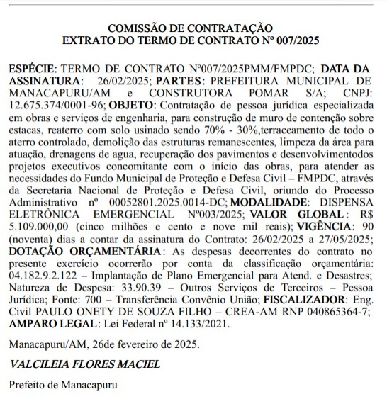 Amazonas – A prefeitura de Manacapuru, município localizado a 84 quilômetros de Manaus, parece ter encontrado na justificativa de “emergência” um atalho conveniente para justificar gastos milionários sem a devida transparência que a população merece. Sob o comando da prefeita Valciléia Maciel (MDB), a administração municipal assinou, no dia 26 de fevereiro, o contrato nº 007/2025, que prevê o desembolso de R$ 5.109.000,00 (cinco milhões e cento e nove mil reais) para a construção de um muro de contenção. A obra, supostamente destinada a atender demandas do Fundo Municipal de Proteção e Defesa Civil (FMPDC), foi classificada como parte de um plano emergencial para desastres, com aval da Secretaria Nacional de Proteção e Defesa Civil. O detalhe? A contratação foi feita sem licitação, diretamente com a construtora Pomar, sediada em Manaus, e só veio a público no Diário Oficial dos Municípios do Amazonas nesta segunda-feira, 17 de março.