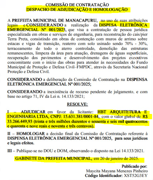 Não é a primeira vez, em menos de três meses de gestão, que Valciléia recorre ao rótulo de “emergência” para justificar decisões que deveriam passar pelo crivo de um processo competitivo. Em fevereiro, outro contrato polêmico foi firmado, desta vez para a reconstrução do cais/pier Terra Preta, ao custo de R$ 33.266.449,93 (trinta e três milhões, duzentos e sessenta e seis mil, quatrocentos e quarenta e nove reais e noventa e três centavos). A beneficiada foi a empresa HBT Arquitetura e Engenharia LTDA, de propriedade de André Alessandro Telles, ex-secretário municipal de Obras, o que levanta suspeitas de favorecimento. Mais uma vez, a prefeita se valeu da Dispensa Eletrônica Emergencial Nº 001/2025, amparada pelo artigo 71, inciso IV, da Lei nº 14.133/2021, que autoriza contratações diretas em casos de calamidade ou urgência. A justificativa apresentada fala em conter danos e realizar intervenções como demolição, limpeza e pavimentação, mas a repetição desse mecanismo começa a soar como uma estratégia para driblar a transparência.