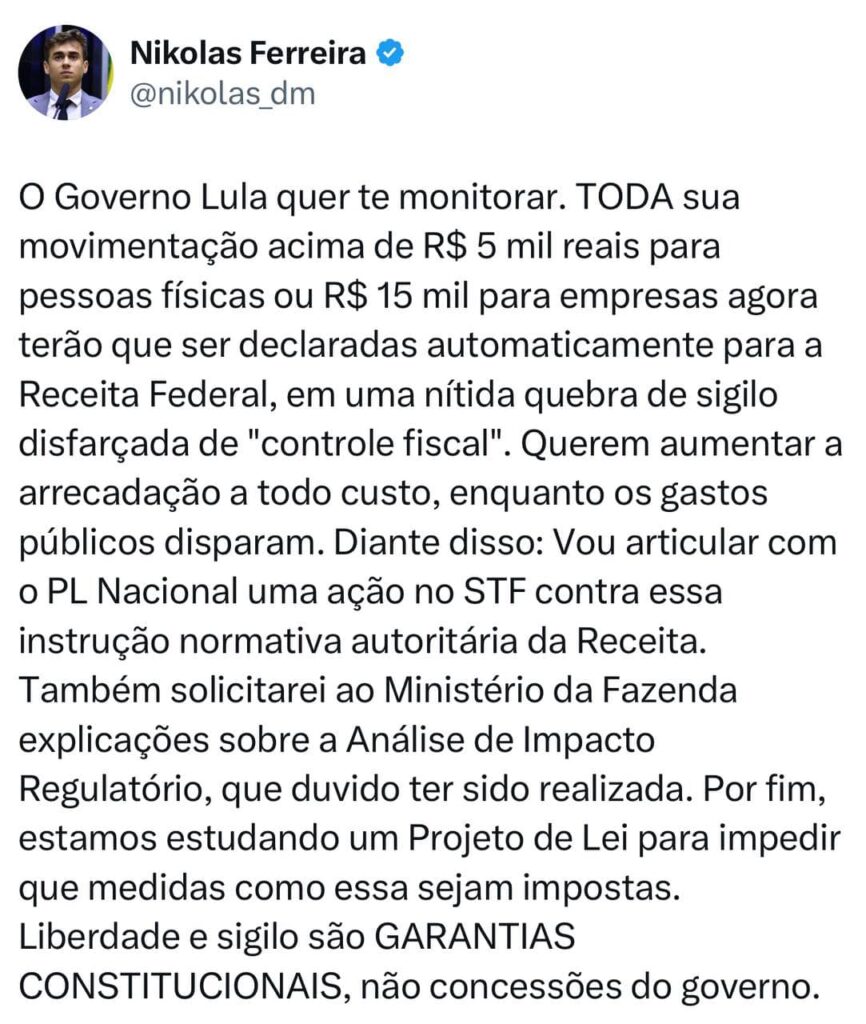 Nikolas Ferreira afirmou que a nova regulamentação é uma tentativa do governo Lula de aumentar a arrecadação fiscal a qualquer custo, ao mesmo tempo em que os gastos públicos continuam a crescer. “O Governo Lula quer te monitorar. TODA sua movimentação acima de R$ 5 mil reais para pessoas físicas ou R$ 15 mil para empresas agora terão que ser declaradas automaticamente para a Receita Federal. Isso é uma nítida quebra de sigilo disfarçada de ‘controle fiscal’”, escreveu em suas redes sociais.