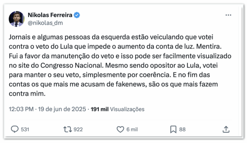 “Claro que eu não votei para poder aumentar sua conta de luz, mas a esquerda vai falar o quê? ‘Nikolas votou a favor disso’. Qual prova tem disso? Nenhuma, porque eu fiz exatamente o contrário”, disse.