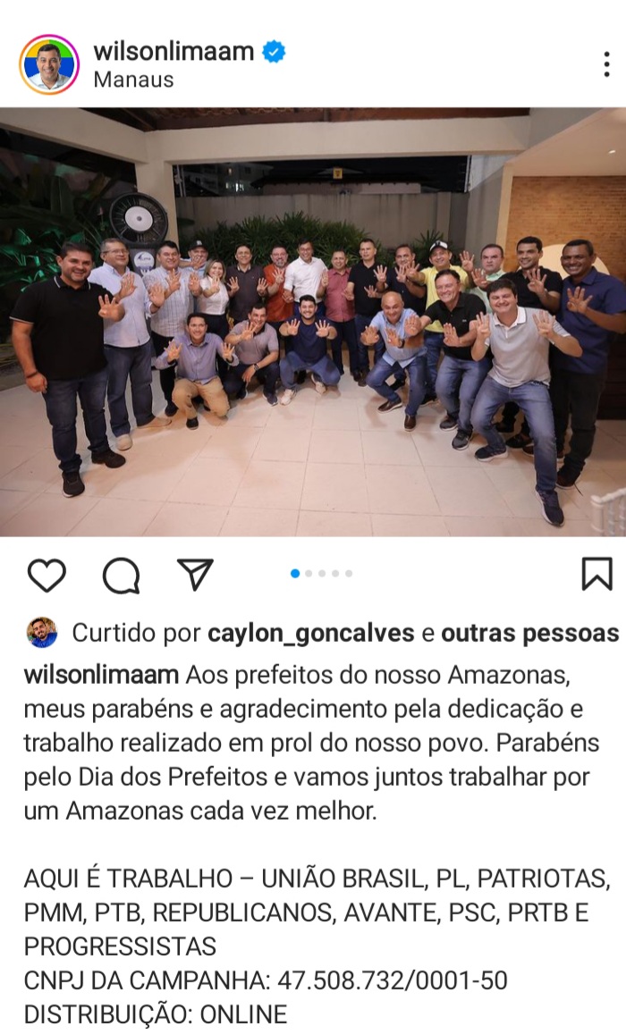 Manaus – Nesta quinta-feira (6), quando é comemorado o Dia do Prefeito, o governador e candidato à reeleição, Wilson Lima (União Brasil), agradeceu os mandatários do Amazonas pela dedicação e trabalho de cuidar de seus municípios.