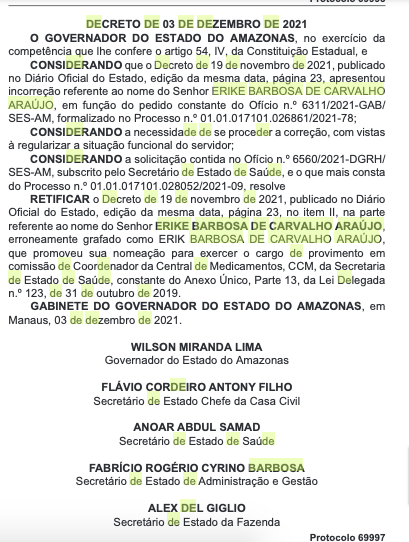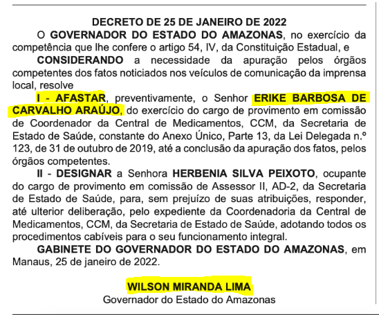 Apesar desse histórico, Wilson Lima nomeou Erike Araújo para comandar a Central de Medicamentos do Amazonas. Foi durante sua gestão que ocorreu o desvio dos três mil testes de Covid-19, em plena crise sanitária, quando a população enfrentava a falta de oxigênio e de insumos hospitalares.