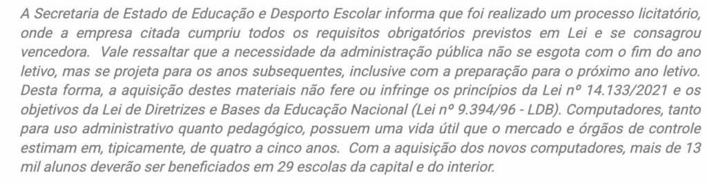 Confrontada, a Seduc-AM emitiu uma nota afirmando que o processo licitatório seguiu todos os trâmites legais e que a empresa vencedora, Suprihouse Informática, cumpriu os requisitos. A secretaria argumenta que “a necessidade da administração pública não se esgota com o fim do ano letivo, mas se projeta para os anos subsequentes” e que os equipamentos possuem vida útil de quatro a cinco anos. A pasta finaliza, prometendo que mais de 13 mil alunos de 29 escolas serão beneficiados.