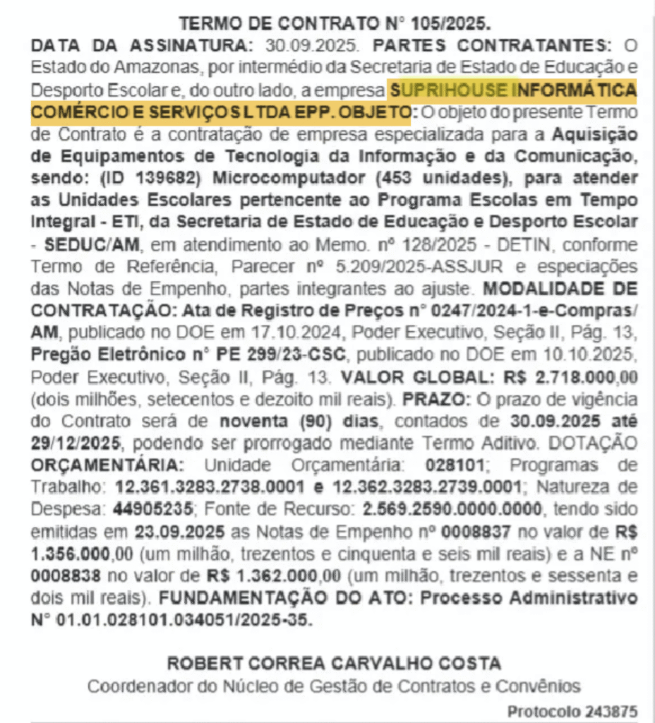 O acordo, identificado pelo contrato nº 105/2025 e publicado no Diário Oficial do Estado (DOE), foi firmado com a empresa manauara Suprihouse Informática Comércio e Serviços Ltda. O que agrava as dúvidas sobre o planejamento da pasta é o prazo de vigência estipulado no documento: apenas três meses, um período que ultrapassa o calendário escolar vigente e levanta suspeitas sobre a real urgência da aquisição.