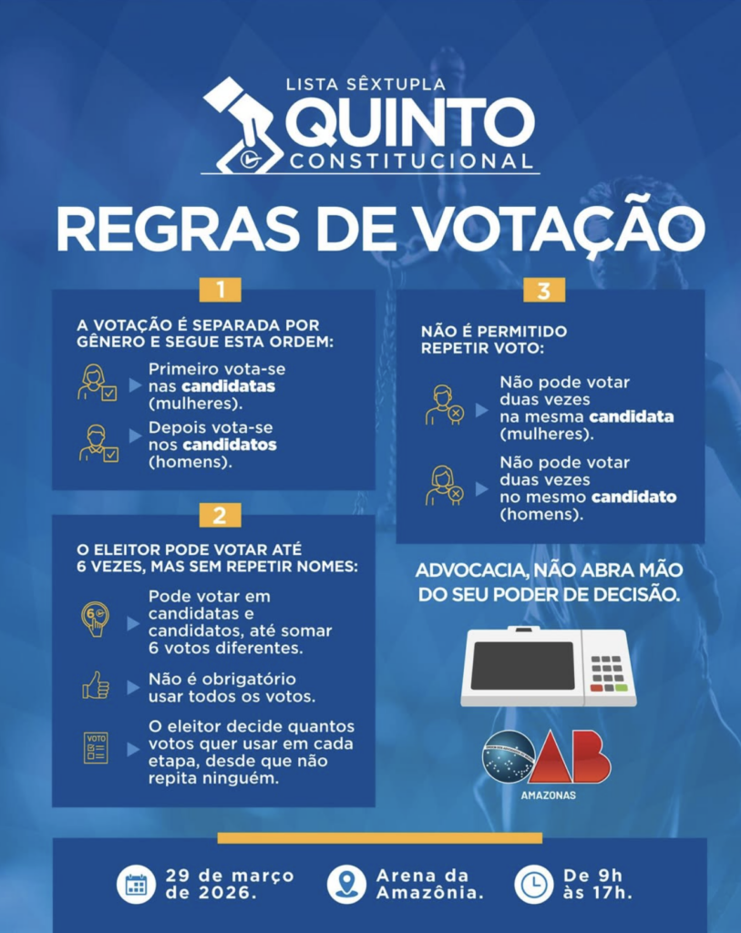 - Votação da Classe: Os advogados inscritos na OAB-AM votarão para formar uma lista sêxtupla paritária, composta obrigatoriamente por três advogadas e três advogados.