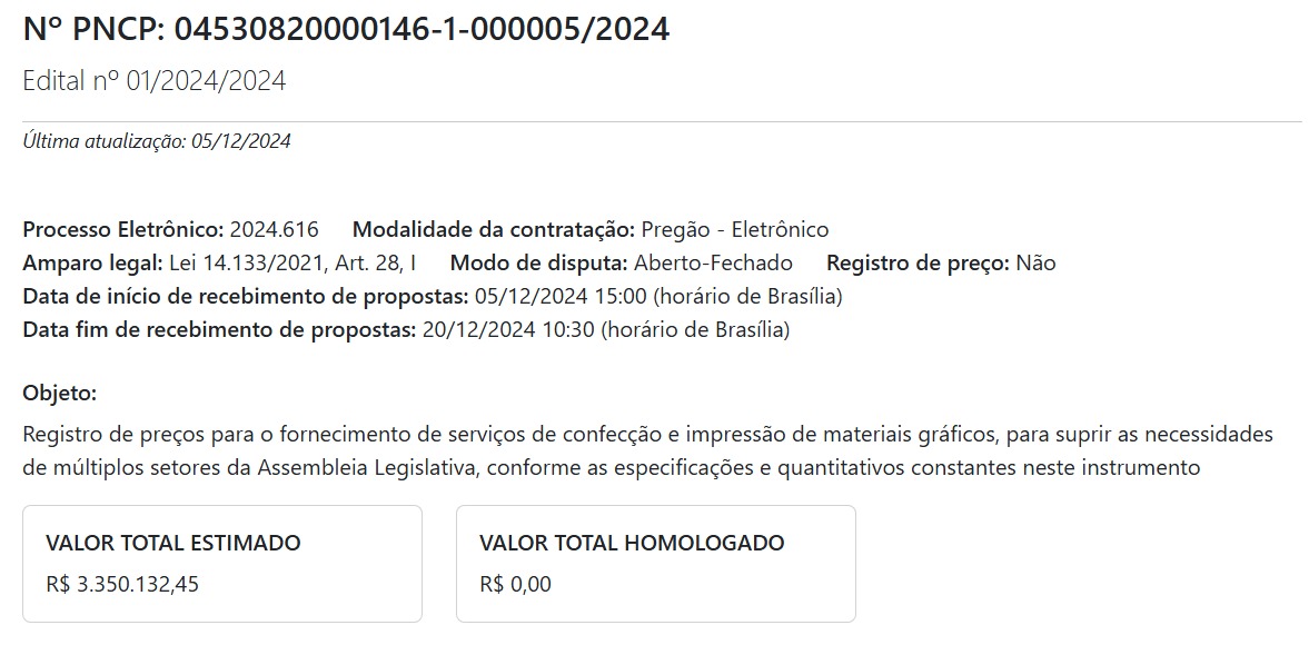 Segundo os dados da transparência da Aleam, a contratação será realizada por meio do pregão eletrônico 2024.616, cujo período para recebimento de propostas teve início em 5 de dezembro de 2024. Os documentos oficiais registram a aquisição sob a modalidade de registro de preços para o “fornecimento de serviços de confecção e impressão de materiais gráficos, para suprir as necessidades de múltiplos setores da Assembleia Legislativa, conforme as especificações e quantitativos constantes no instrumento”, conforme descrito no certame.