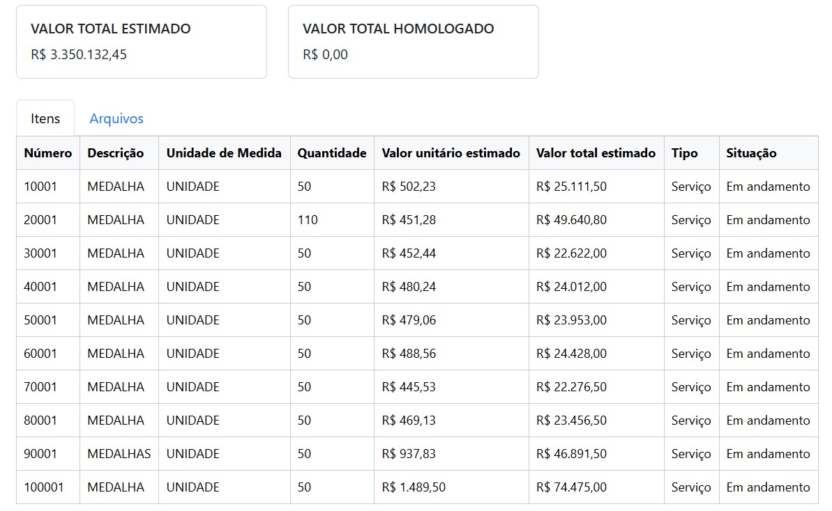 Entretanto, entre os itens listados para fornecimento, destacam-se diversos tipos de medalhas destinadas a honrarias. O processo licitatório, que foi encerrado no dia 20 de dezembro de 2024, estima um gasto total de R$ 3.350.132,45 para a aquisição desses materiais.
