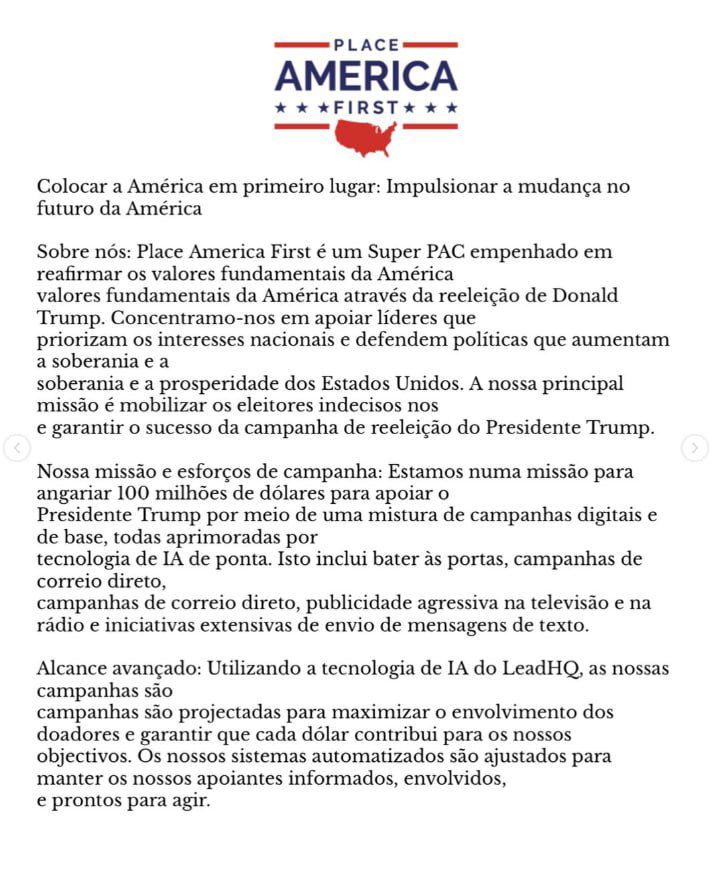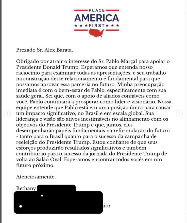A carta, assinada por Bethany Barata, membro do Super PAC Place America First, confirma o interesse do grupo em estreitar os laços com Pablo Marçal, ressaltando sua influência no Brasil e no cenário global. O documento, amplamente divulgado por Marçal em suas redes sociais, desmente a matéria do Metrópoles, que afirmou categoricamente que Trump nunca teria enviado tal correspondência.