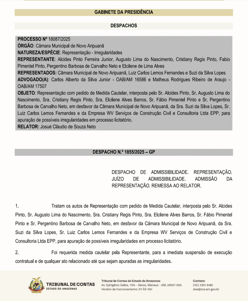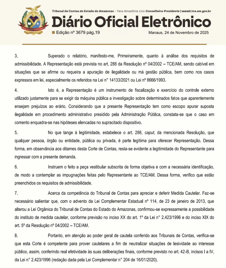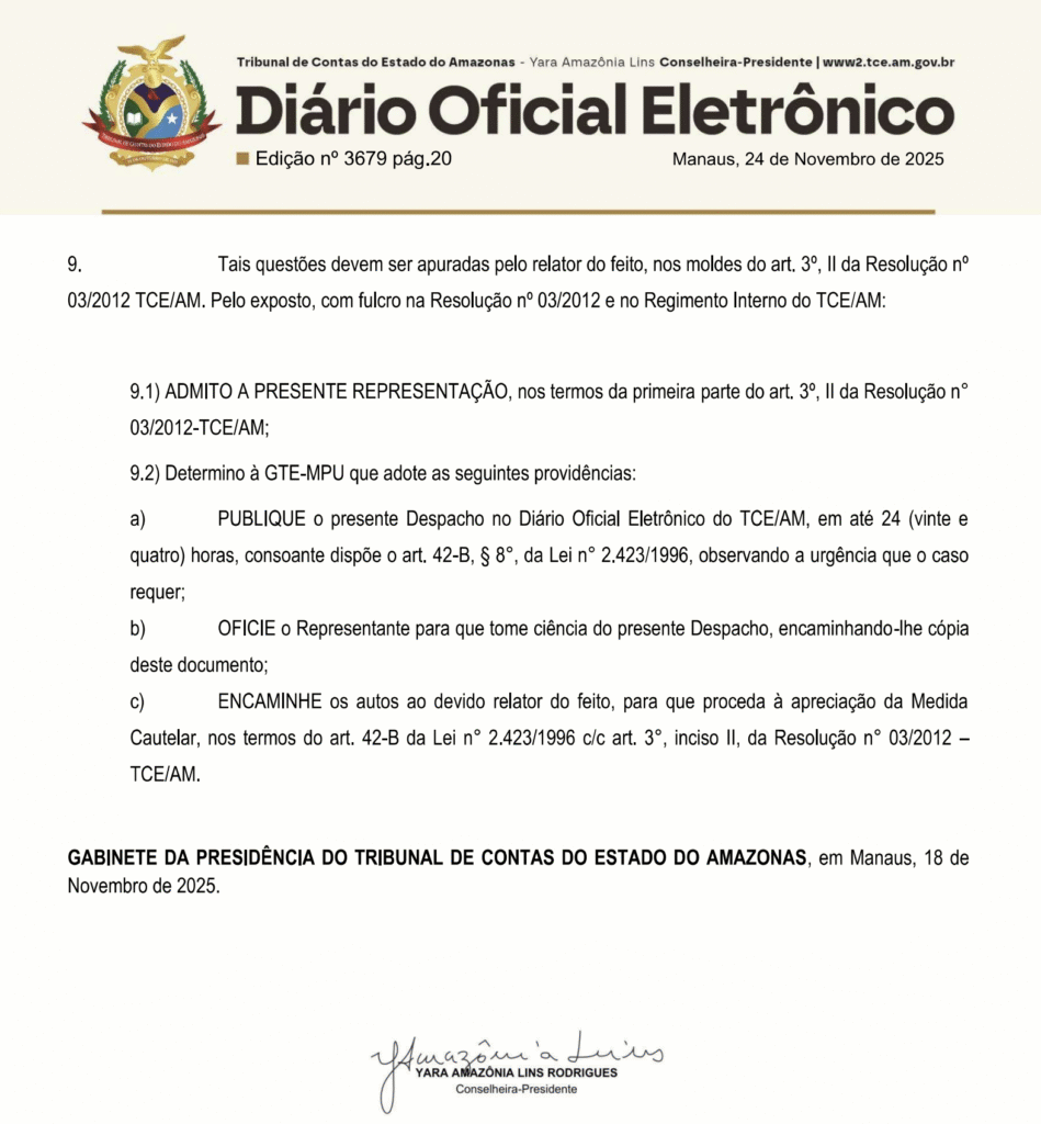 O TCE-AM analisou o pedido dos vereadores e reconheceu que existem indícios de falhas no processo e determinou que a Câmara apresente, em até cinco dias úteis, toda a documentação da licitação, contratos e comprovantes de pagamento já realizados.