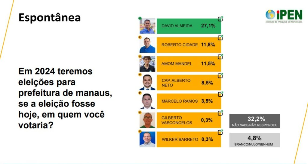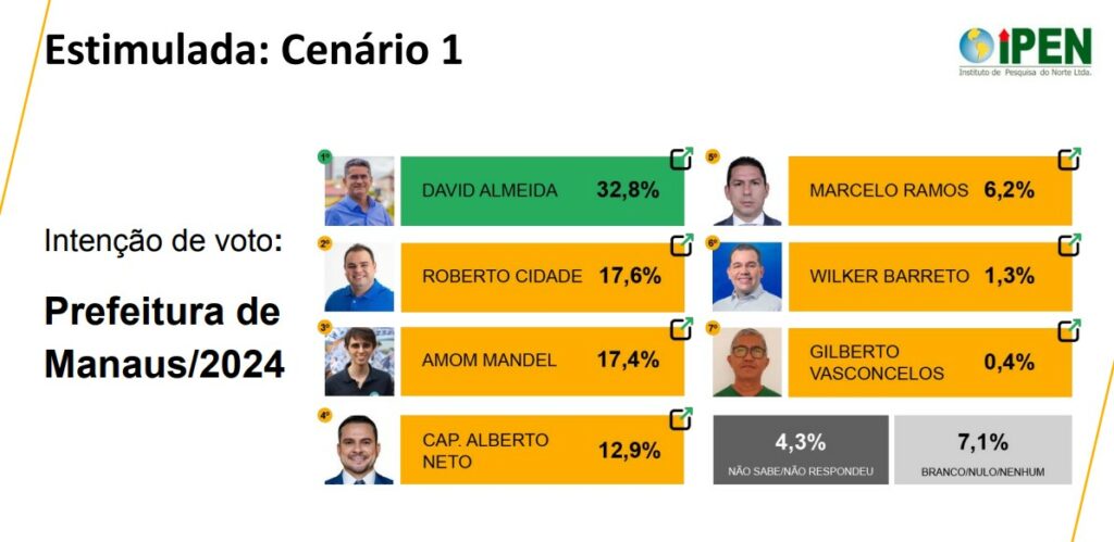 Manaus – O Instituto de Pesquisa do Norte (IPEN) revelou, nesta segunda-feira (23), resultados que podem alterar o panorama político da capital amazonense nas próximas eleições. Com David Almeida (Avante) liderando com 32,8% das intenções de voto, a pesquisa demonstra um fortalecimento da confiança dos eleitores no atual prefeito, enquanto seus adversários, Roberto Cidade (União Brasil) e Amom Mandel (Cidadania), estão presos em um empate técnico com apenas 18% cada.