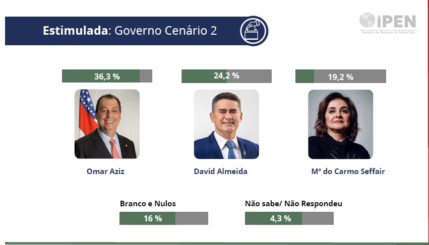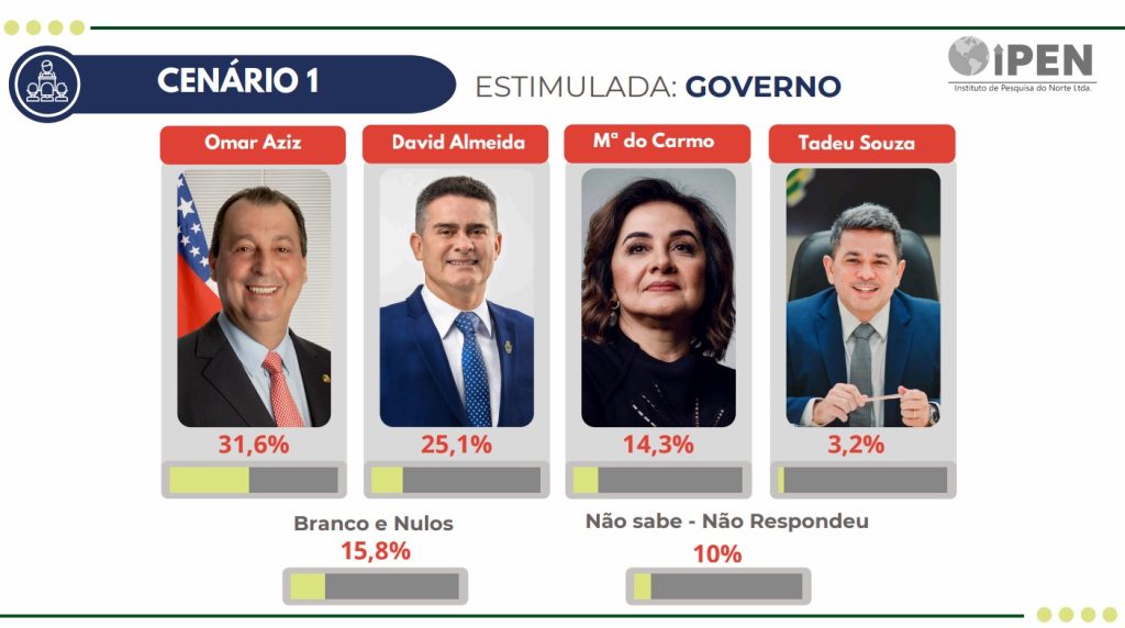Nos levantamentos do IPEN, a evolução dos candidatos segue um comportamento natural: Omar Aziz mantém liderança constante, Maria do Carmo oscila dentro de uma margem esperada e David Almeida aparece crescendo de forma gradual, chegando a mais de 33% dos votos válidos no cenário principal de novembro. Esse padrão se repete nas duas pesquisas presenciais e confirma um cenário consistente.