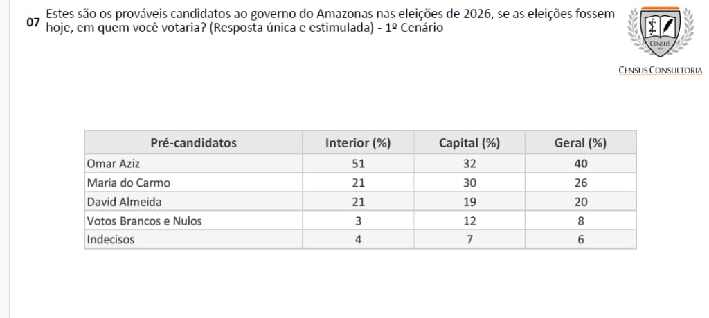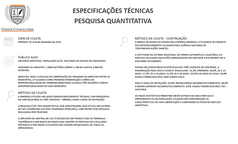 Manaus – A comparação entre duas pesquisas do IPEN e o levantamento divulgado pela Census Consultoria – que atua há pouco tempo com pesquisas – mostra um contraste tão grande que levanta dúvidas sobre a credibilidade dos números apresentados pela empresa. Enquanto o IPEN realizou pesquisas presenciais em julho e novembro e registrou resultados estáveis e coerentes entre si, a pesquisa da Census, feita por telefone no início de dezembro, rompe completamente com qualquer tendência observada até agora.
