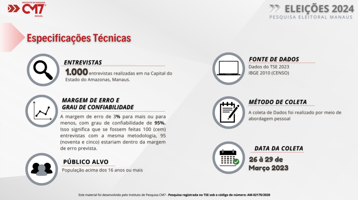 Amazonas – O Instituto de Pesquisa CM7 Brasil revela as intenções de voto na capital amazonense para as eleições municipais de 2024, que irá definir quem comandará a Prefeitura de Manaus pelos próximos quatro anos. Registrada no TSE sob o código de número: AM-02170/2020, a pesquisa eleitoral entrevistou mil pessoas na capital durante o período de 26 a 29 de março de 2023.