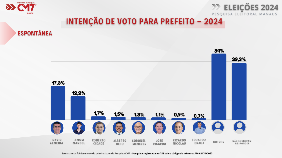 Na pesquisa espontânea, o atual prefeito de Manaus, David Almeida (Avante), aparece com 17,3% das intenções de votos, seguido do deputado federal Amom Mandel (Cidadania) que ocupa o segundo lugar nas intenções, com 12,2%. Roberto Cidade (União Brasil) e Alberto Neto (Partido Liberal) ocupam o terceiro e quarto lugar, respectivamente, na opinião popular.