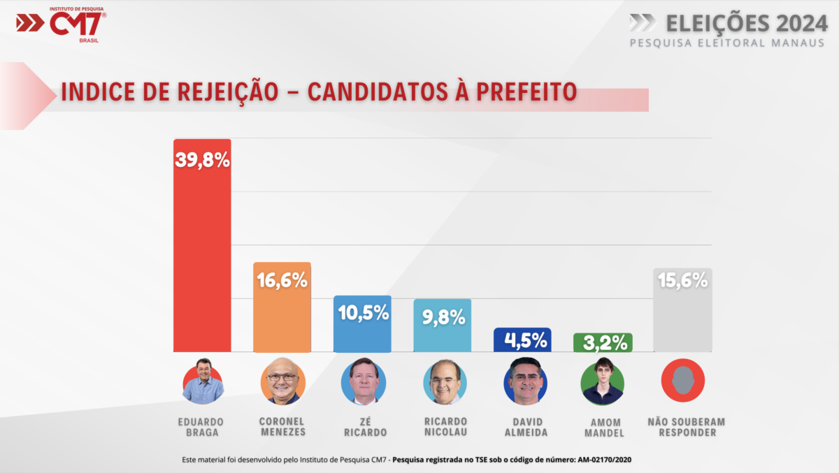 Outro nome que se destaca no que diz respeito à rejeição do eleitorado é o ex-superintendente da Suframa, Coronel Menezes (PL). Zé Ricardo (PT) e Ricardo Nicolau (Solidariedade), respectivamente, também não foram apontados pelo público entrevistado como opções de voto.