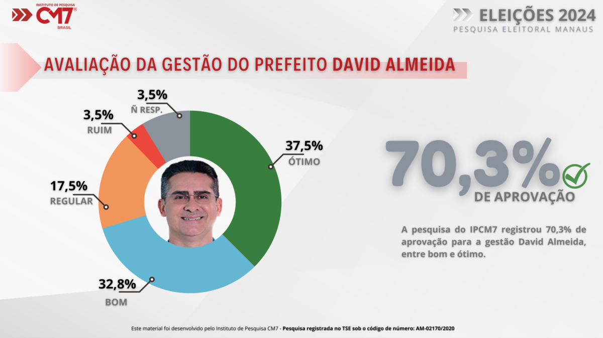 A coleta de dados realizada pelo Instituto de Pesquisa CM7 Brasil também buscou saber a opinião do eleitorado referente à gestão do Prefeito David Almeida (Avante). A pesquisa registrou que 70,3% dos entrevistados aprovam a atual gestão, rotulando-a como boa e ótima, enquanto 17,5% a considera regular e 3,5% desaprova.
