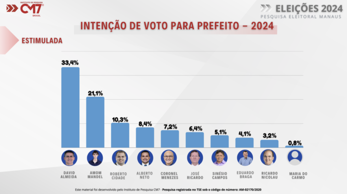 Na pesquisa estimulada, o cenário se repete. David Almeida (Avante) segue ocupando o primeiro lugar, com 33,4% das intenções de voto, enquanto Amom Mandel (Cidadania) aparece com 21,1%.