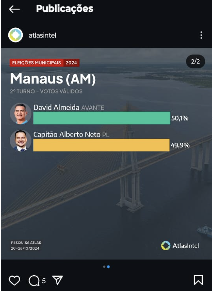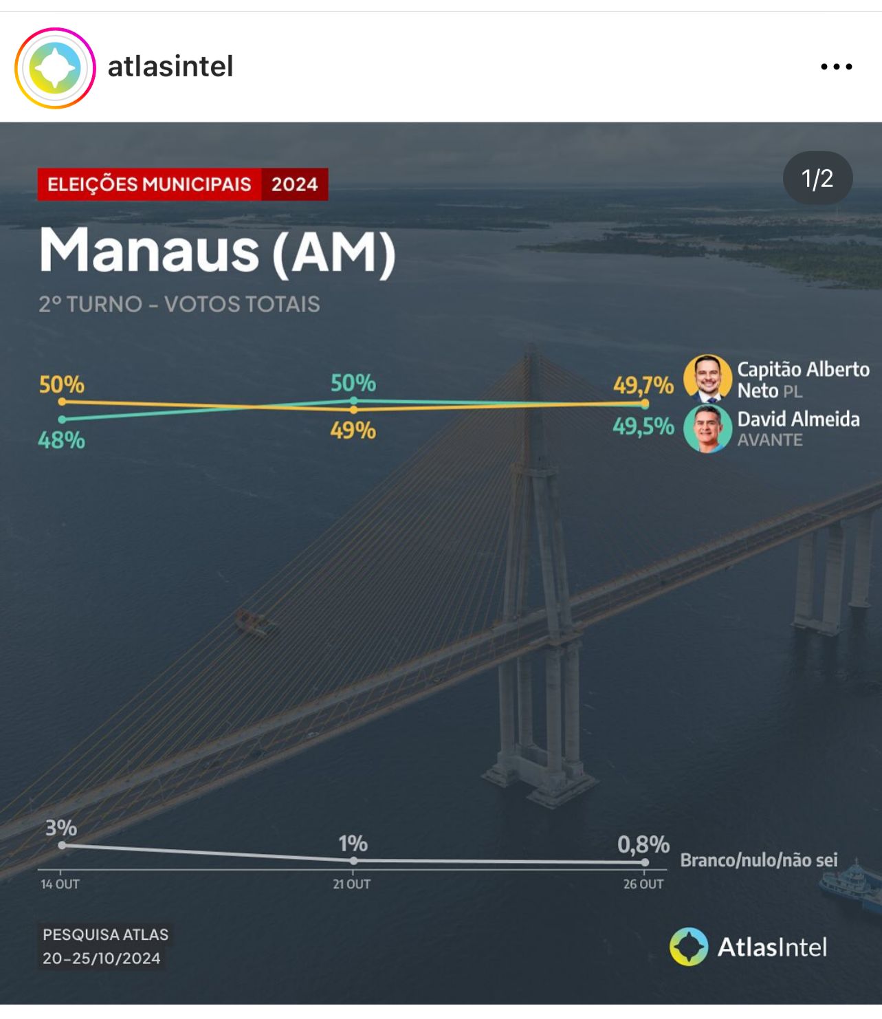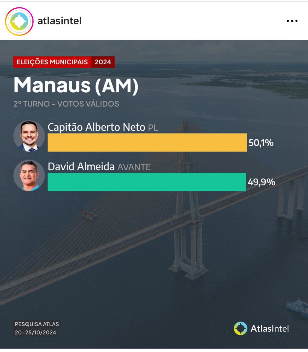 Manaus – Neste sábado, véspera das eleições municipais, o Instituto de Pesquisa Atlas Intel divulgou sua última pesquisa sobre o segundo turno em Manaus, onde os candidatos Alberto Neto e David Almeida se enfrentam. A pesquisa inicialmente apontava David Almeida na liderança com 50,1% dos votos válidos, enquanto Alberto Neto aparecia com 49,9%. Nos votos totais, Almeida liderava com 49,7% contra 49,5% de Neto.