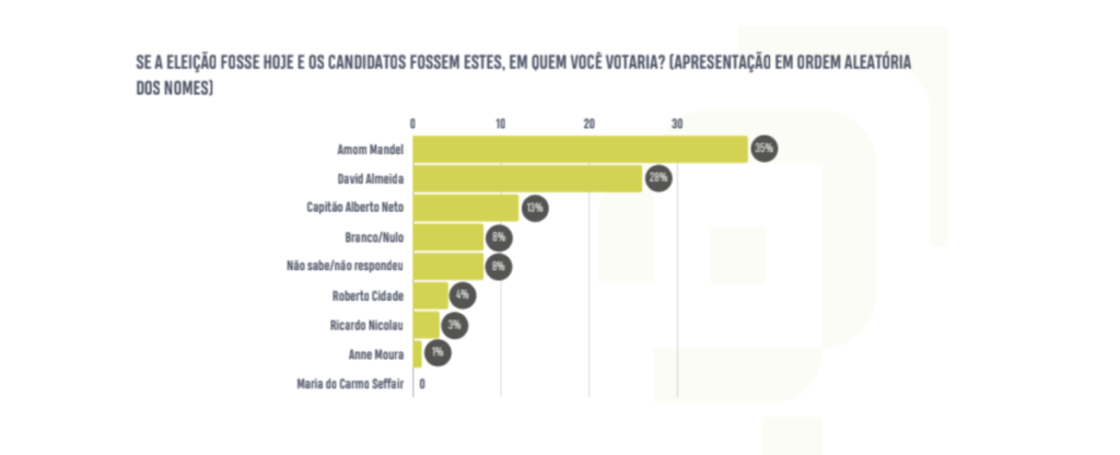 De acordo com levantamento, Amom Mandel (Cidadania) lidera a disputa pela Prefeitura de Manaus com 35%, enquanto o prefeito David Almeida tem 28%. Capitão Alberto Neto (PL) vem terceiro com 13%. Na sequência, Roberto Cidade (União Brasil) com 4% e Ricardo Nicolau (Solidariedade) 3% e Anne Moura (PT) com 1%. A empresária Maria do Carmo Seffair (Novo) não pontuou. Os eleitores que declararam votar branco e nulo somam 8% e não sabe/não respondeu também 8%.