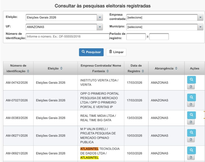 Ao consultar o site oficial do TSE, constata-se que, para as eleições gerais de 2026 no Amazonas, existe apenas um registro de pesquisa da AtlasIntel, sendo um estudo voltado para o governo do estado, registrado em 10 de março e com divulgação prevista para 16 de março, realizado entre os dias 10 e 15. No entanto, ao buscar informações sobre pesquisas para o Senado, não há nenhum documento comprovando que a pesquisa teria sido registrada, o que caracteriza irregularidade legal.