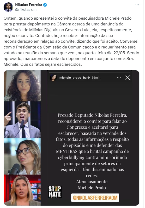 – Ontem, quando apresentei o convite da pesquisadora Michele Prado para prestar depoimento na Câmara acerca de uma denúncia da existência de Milícias Digitais no Governo Lula, ela, respeitosamente, negou o convite. Contudo, hoje recebi a informação da sua reconsideração em relação ao convite, dizendo que foi aceito. Conversei com o presidente da Comissão de Comunicação e o requerimento será votado na reunião da semana que vem, na quarta-feira dia 22/05. Sendo aprovado, marcaremos a data do depoimento em conjunto com a sra. Michele. Que os fatos sejam esclarecidos – escreveu Nikolas.