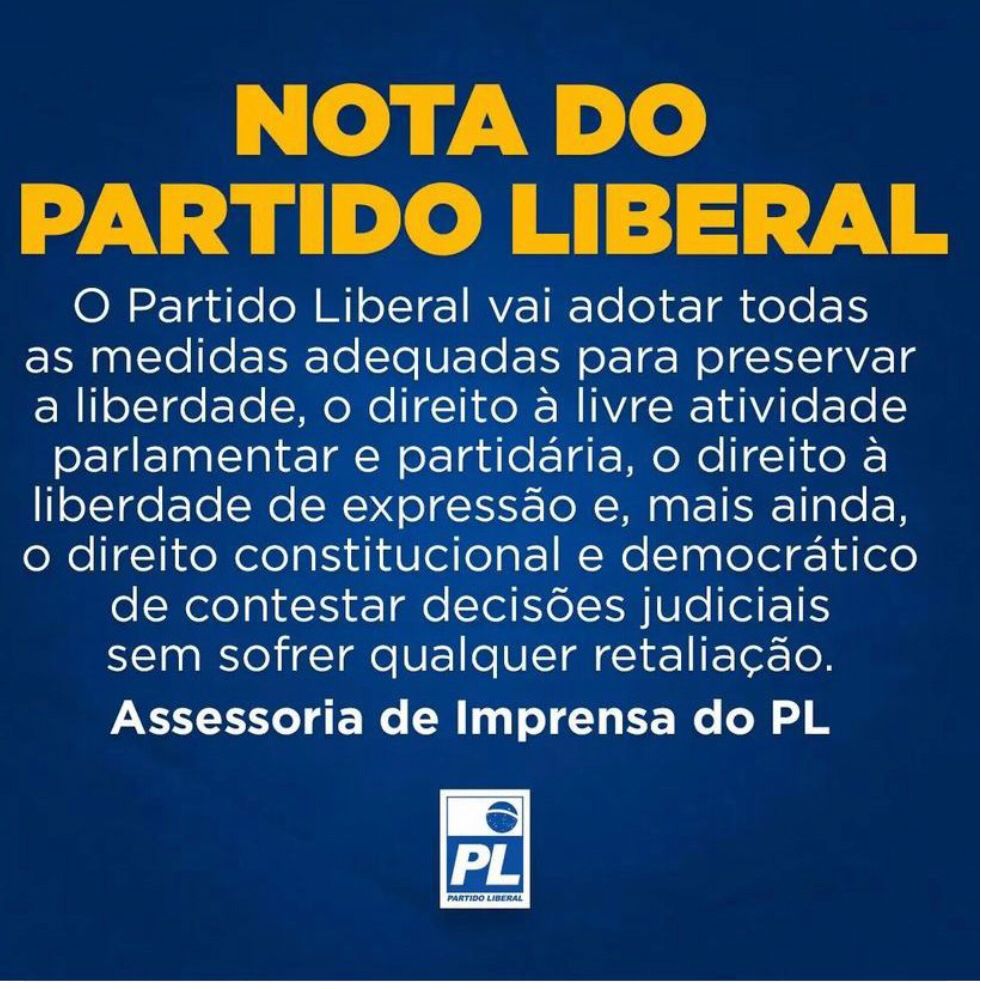 “O Partido Liberal vai adotar todas as medidas adequadas para preservar a liberdade, o direito à livre atividade parlamentar e partidária, o direito à liberdade de expressão e, mais ainda, o direito constitucional e democrático de contestar decisões judiciais sem sofrer qualquer retaliação.” O PL não informa nenhum detalhe das medidas que serão adotadas.