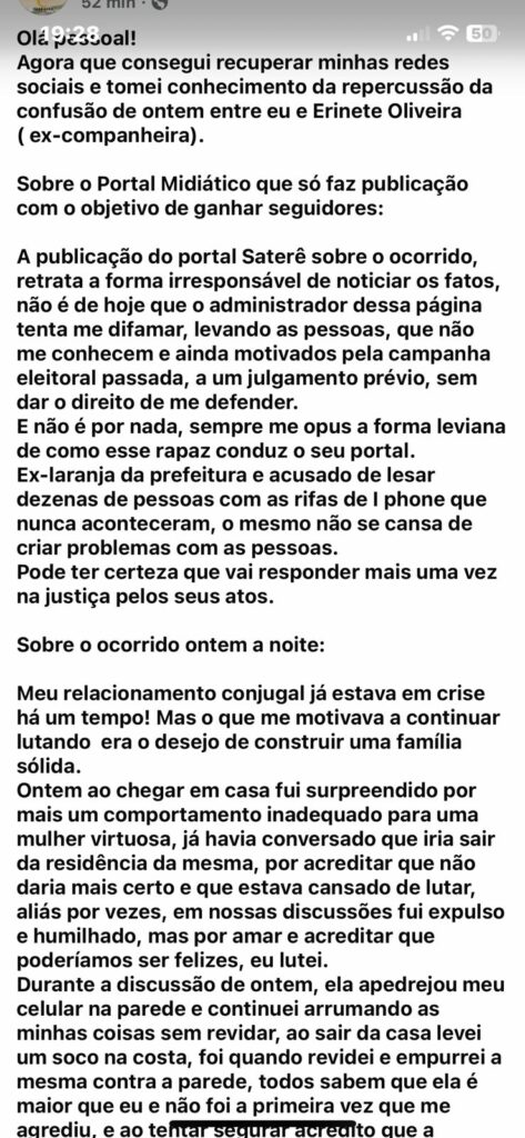 “Olá pessoal!Agora que consegui recuperar minhas redes sociais e tomei conhecimento da repercussão da confusão de ontem entre eu e Erinete Oliveira (ex-companheira).