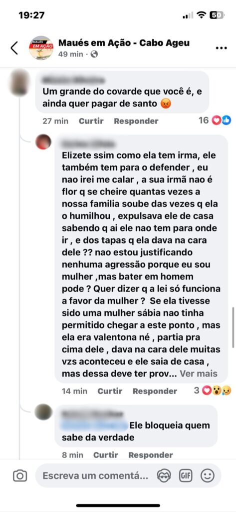 A resposta da família de ex-esposa foi dura: “Quer pagar de santo, você é um grande covarde!”. Uma outra familiar que também tentou se manifestar disse o seguinte: “Ele bloqueia quem sabe da verdade”.