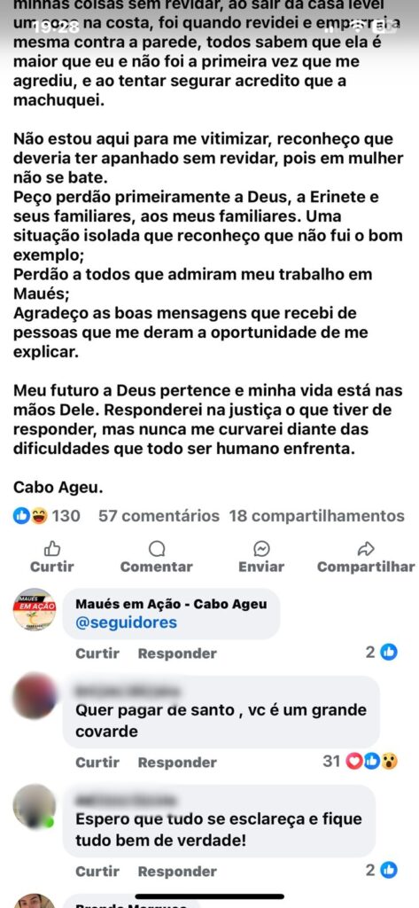 Após a denúncia, Cabo Ageu utilizou suas redes sociais para se defender, mas a publicação acabou por piorar sua situação. No texto, ele não só reconheceu a agressão mas também atacou a imprensa e se referiu a si mesmo como vítima, o que gerou uma onda de críticas, especialmente dos familiares de sua ex-esposa, que o acusaram de “se vitimizar”.