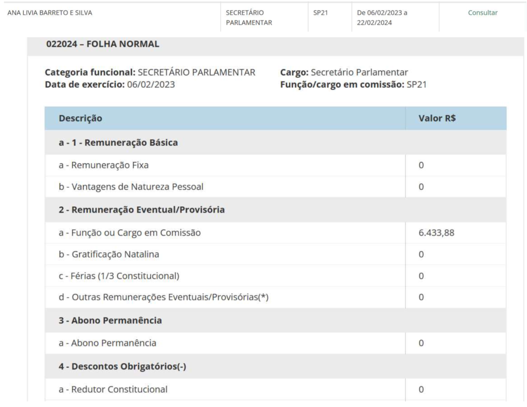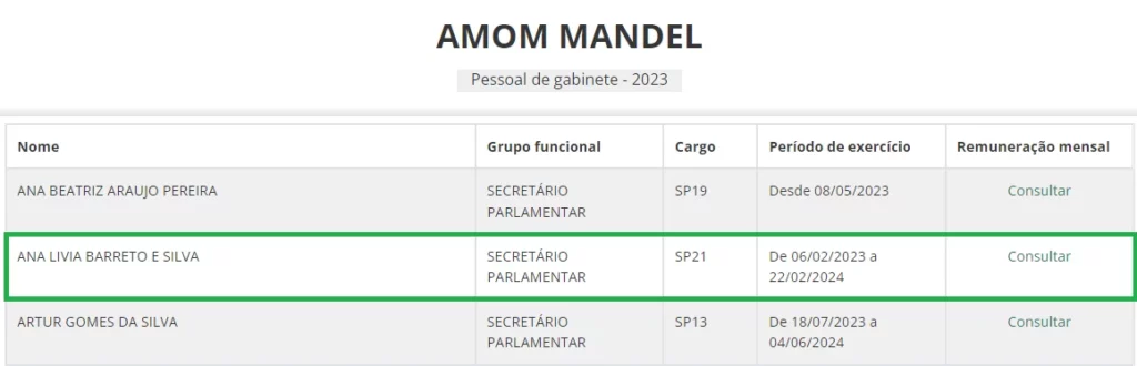 Lívia foi nomeada como Secretária Parlamentar (SP21) de 06/02/2023 a 22/02/2024 com um salário de R$ 6.433,88. Ela está ao lado de Amom Mandel desde a época de vereador, tendo trabalhado como assessora (APC-15) no início de sua carreira política.