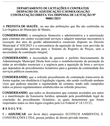 Sendo assim, a ausência de licitação e o montante elevado levantam dúvidas sobre a urgência da medida, reforçando a necessidade de fiscalização por órgãos de controle e pela sociedade. A Prefeitura de Maués não se manifestou sobre o assunto que gerou polêmica.