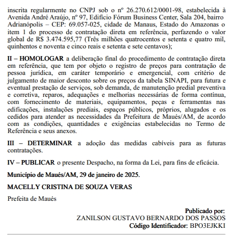 Amazonas – A Prefeita de Maués, Macelly Cristina de Souza Veras, assinou um contrato emergencial de R$ 3.474.595,77 com a empresa Ecotech Ambiental e Construções LTDA, de Manaus, para serviços de manutenção em prédios públicos. A contratação, feita sem licitação, foi publicada na edição de 17 de fevereiro do Diário Oficial dos Municípios do Amazonas, com base no processo nº 90001/2025.