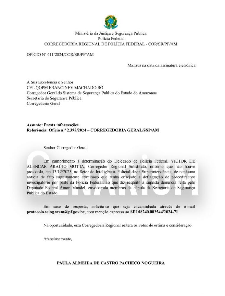 “Não houve protocolo de nenhuma notícia de fato supostamente criminoso no Setor de Inteligência Policial desta Superintendência [do Amazonas] a partir de suposta denúncia feita pelo deputado federal Amom Mandel”, diz o ofício.