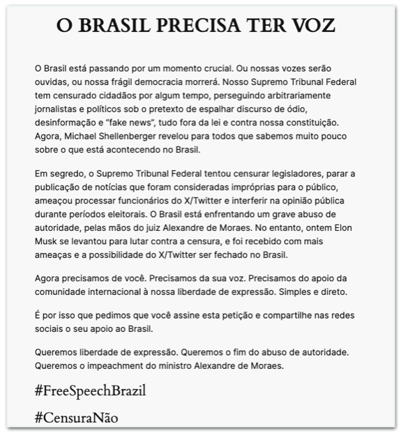 Na carta manifesto, o jornalista Michael Shellenberger adverte para o iminente perigo de uma ditadura no Brasil. “A qualquer momento, o Supremo Tribunal Federal poderá bloquear completamente o acesso ao Twitter/X para os cidadãos brasileiros”, escreveu. “Não é exagero afirmar que o Brasil está à beira de uma ditadura, comandada por um ministro totalitário do Supremo Tribunal Federal, conhecido como Alexandre de Moraes.”