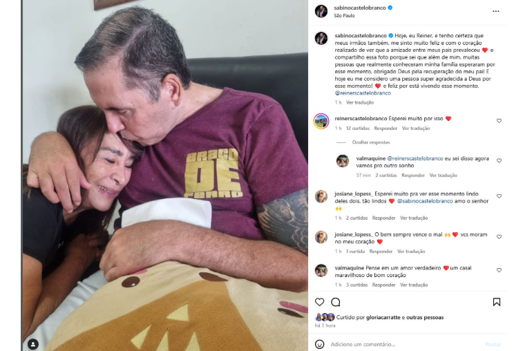 Nessa segunda-feira (3), seu filho, Reiner Castelo Branco (Avante), compartilhou nas redes sociais uma imagem que tocou o coração de muitos: Sabino, abraçado à ex-esposa Vera Lúcia Castelo Branco, também ex-parlamentar pelo estado. Na legenda, Reiner escreveu que o momento “era esperado por ele e por sua família”, expressando gratidão pela recuperação do pai, que sofreu um Acidente Vascular Cerebral (AVC) em 2017, e celebrando a amizade que prevaleceu entre os pais, apesar da separação em 2012.